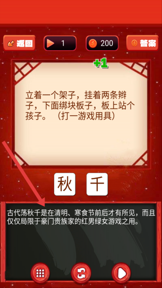 4、猜對燈謎后,界面會顯示答案解析,像關于古代秋千的相關介紹,幫助了解燈謎答案的背景知識。