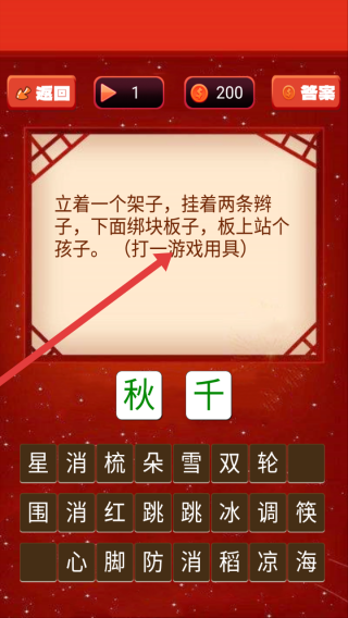 3、猜謎界面,就會看到板子上顯示燈謎題目,打一游戲用具需從給出的字中選擇組成答案。