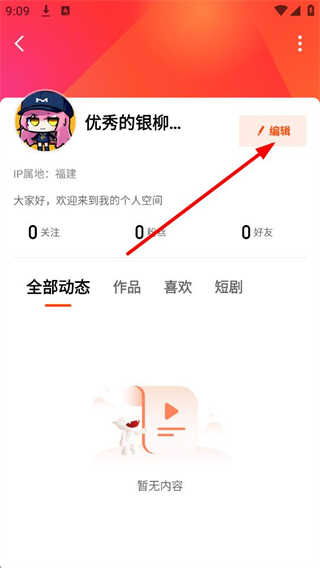 4、登錄后進入個人空間,可看到用戶昵稱、IP屬地、個人簡介,還有關注、粉絲、好友數量,點擊編輯可對個人信息進行修改,下方有全部動態、作品等分類欄。