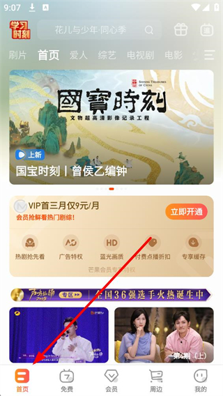 1、進入芒果TV首頁,可看到國寶時刻等內容推薦,還有VIP會員開通入口及熱劇搶先看、藍光畫質等會員特權展示,下方有不同節目推薦卡片。