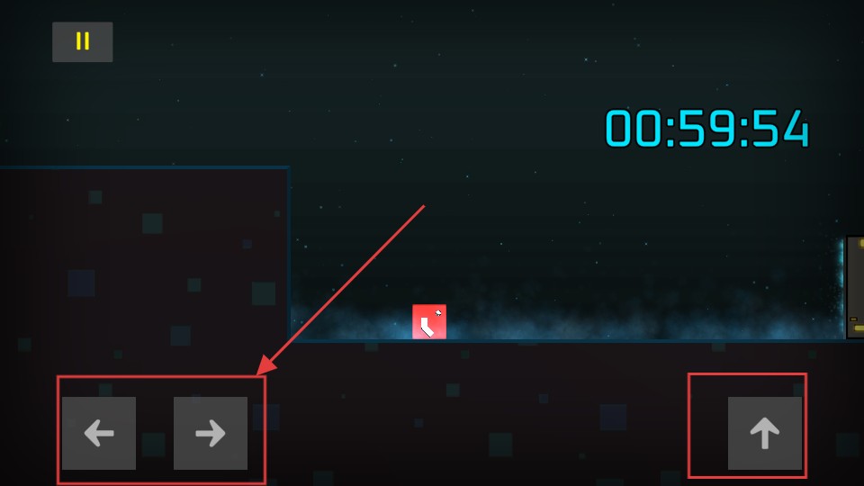 2、在關卡場景中屏幕下方有左右方向和向上的控制按鈕,操控紅色方塊,利用左右按鈕移動,遇到需要跳躍的地方,點擊向上按鈕讓方塊跳躍,朝著目標前進。