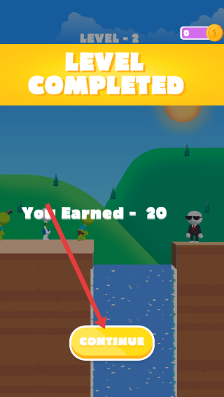 4、成功完成LEVEL2后,界面顯示LEVELCOMPLETED,并提示獲得20的獎勵,點擊CONTINUE可繼續下一關游戲。