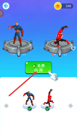 4、進入合并界面,能看到不同的英雄角色,點擊免費合并按鈕,可將英雄進行合并,推進游戲進程。