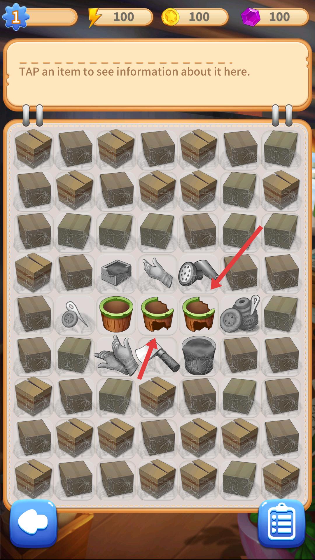 2、游戲界面有許多帶蛛網的箱子和各類物品,點擊物品可查看信息,要留意可合并的物品,通過合并來獲取新物品,推進游戲進程。
