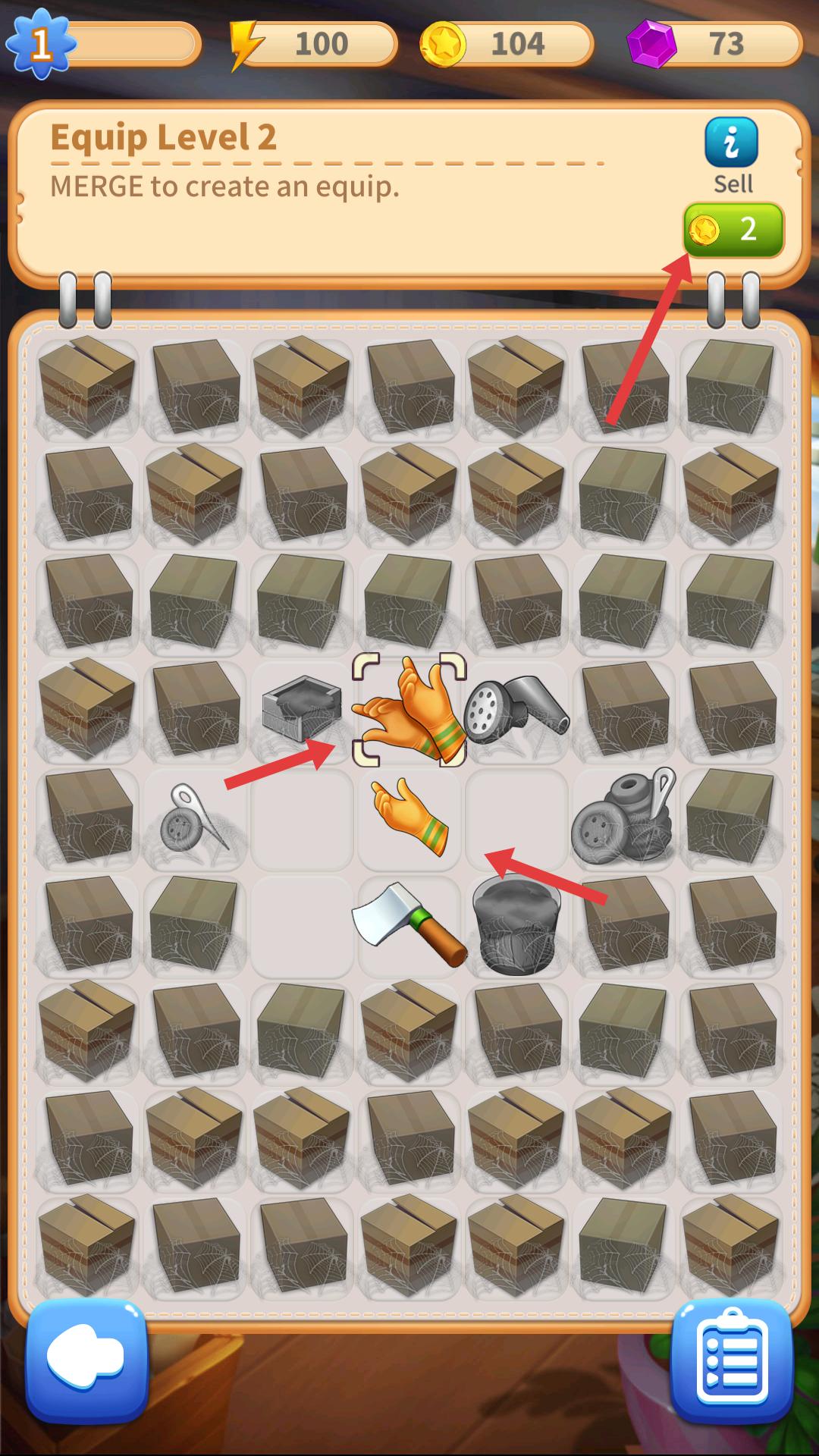 1、基礎合并操作:拖拽相鄰的相同物品進行組合升級,每次成功合并會清出棋盤空間并獲得更高階工具或建筑材料。