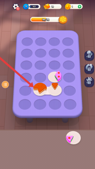 2、進入游戲后,紫色帶圓孔的板子上,可拖動提拉米蘇形狀的拼圖塊放置,右側有幾個功能按鈕,需合理擺放拼圖塊。