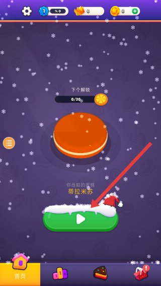 1、游戲開始界面有雪花飄落,當前蛋糕是提拉米蘇,下方綠色按鈕可開始游戲,還顯示下個解鎖進度,朝著新蛋糕努力。