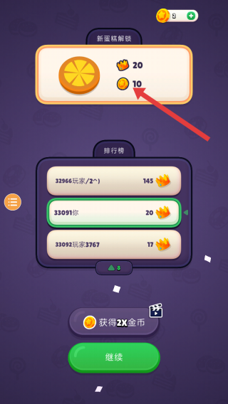 4、解鎖新蛋糕后,會顯示獲得的獎勵,有皇冠和金幣,還能看到排行榜情況,下方綠色繼續按鈕可開啟后續游戲。
