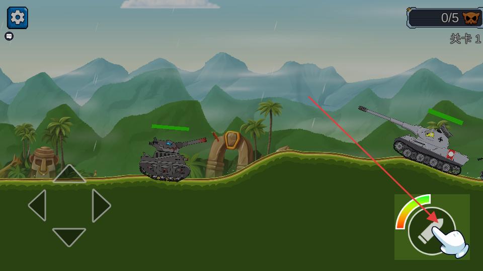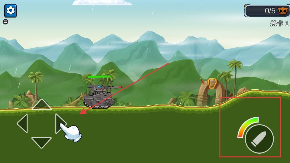 2、進入關卡1的戰斗場景,使用左側的方向鍵控制坦克移動,在綠色地形和山脈背景中行駛,同時留意右側的射擊進度條,為攻擊敵方坦克做準備。