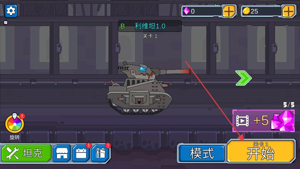 1、在關卡選擇界面點擊開始按鈕,有鉆石、金幣數量顯示,以及旋轉等功能按鈕,準備駕駛坦克戰斗。