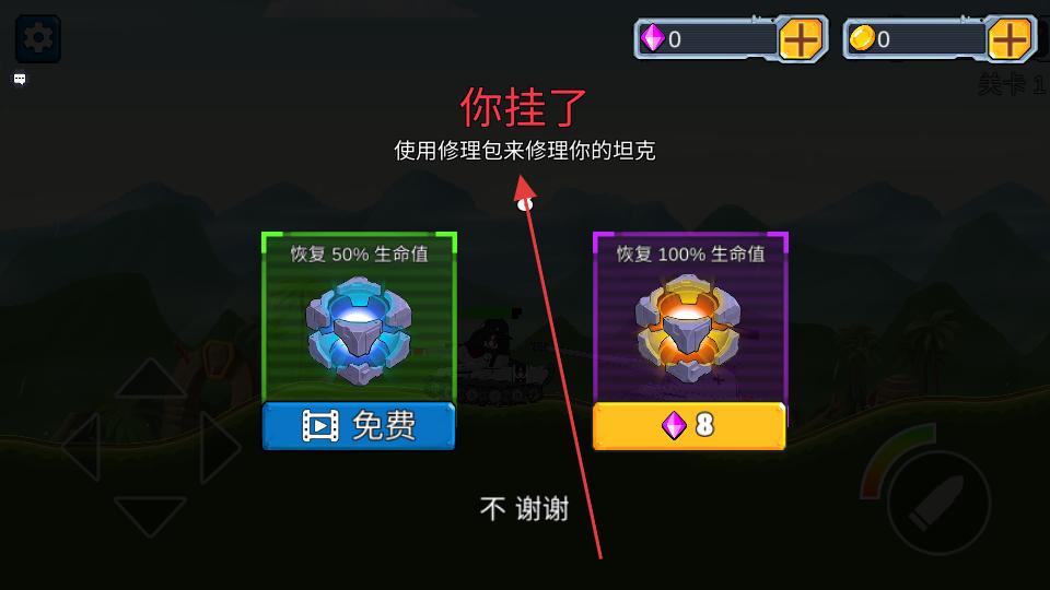 4、若坦克被摧毀屏幕會顯示你掛了,此時可選擇使用修理包恢復生命值,也能點擊不謝謝重新挑戰,通過不斷嘗試提升戰斗技巧,完成關卡任務。