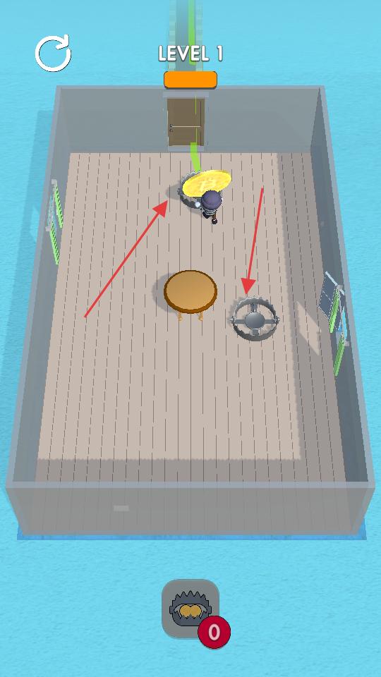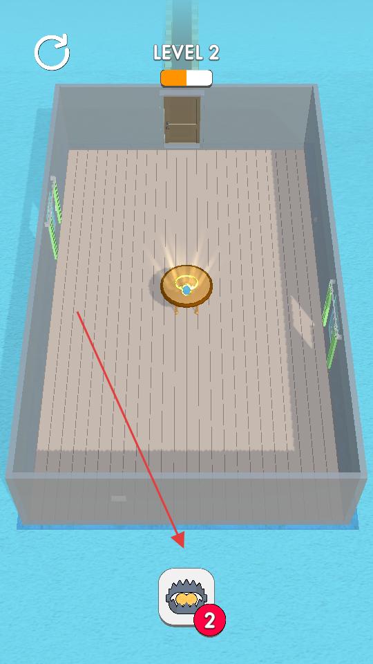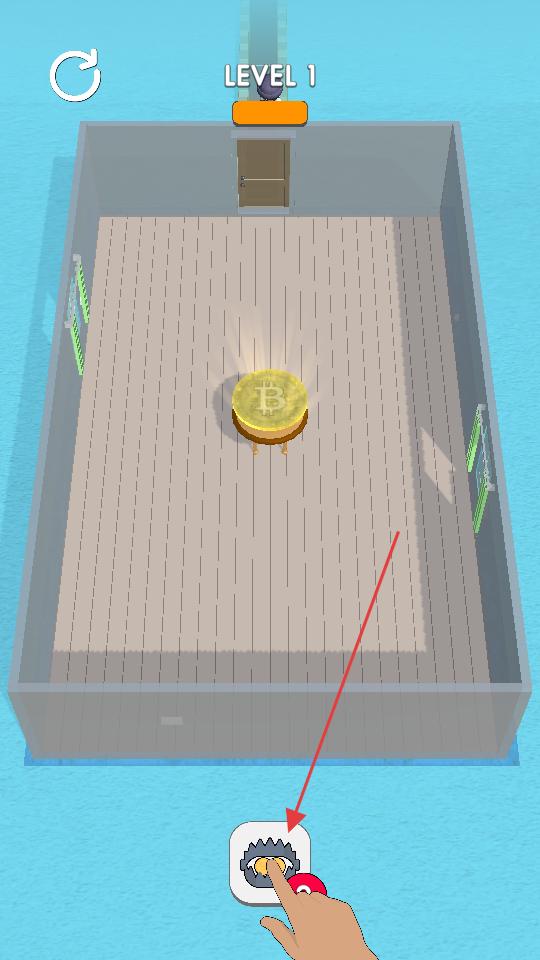 1、在Level1界面點擊下方的齒輪道具按鈕,準備使用道具,此時房間中間有發光的金幣,為搶奪金幣做好準備。