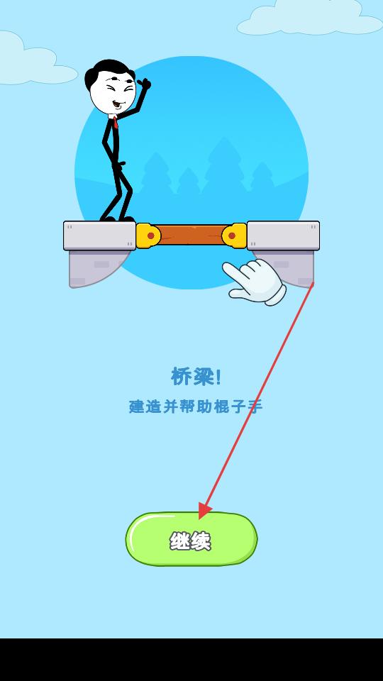 1、點擊界面下方的繼續按鈕,進入游戲關卡此時能看到火柴人站在斷橋一側,下方有木板道具,準備開始建造橋梁的操作。