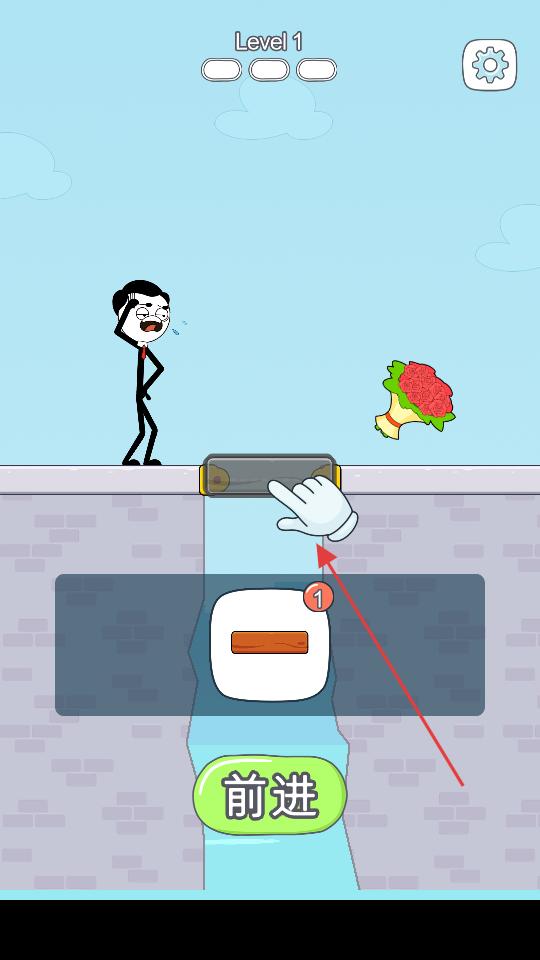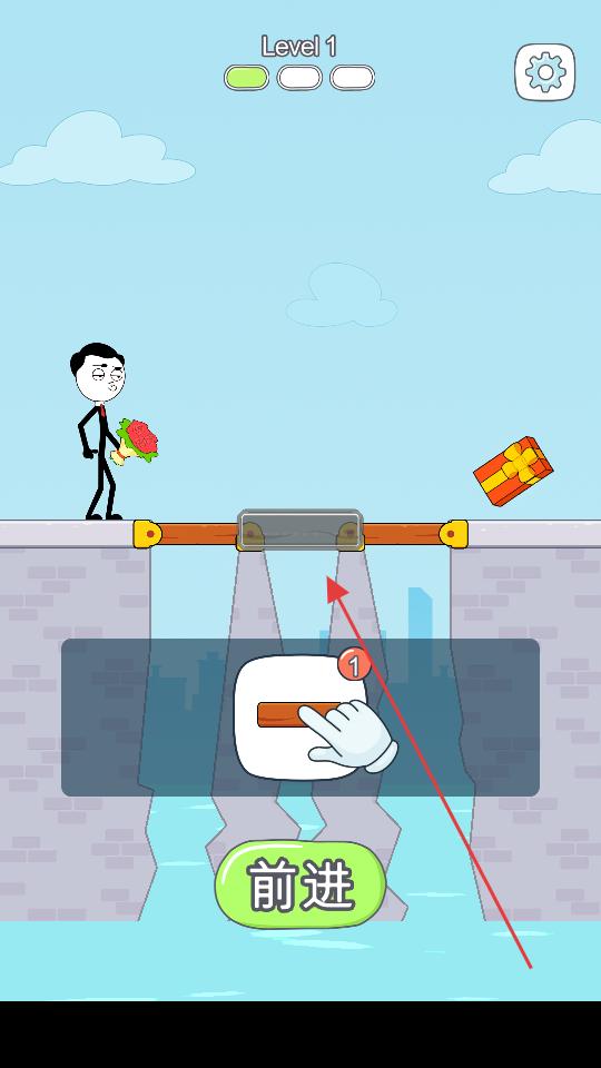 2、將下方的木板拖到斷橋的缺口處,搭建出一段橋梁然后點擊前進按鈕,火柴人會向前移動,同時可以收集到鮮花類的道具。