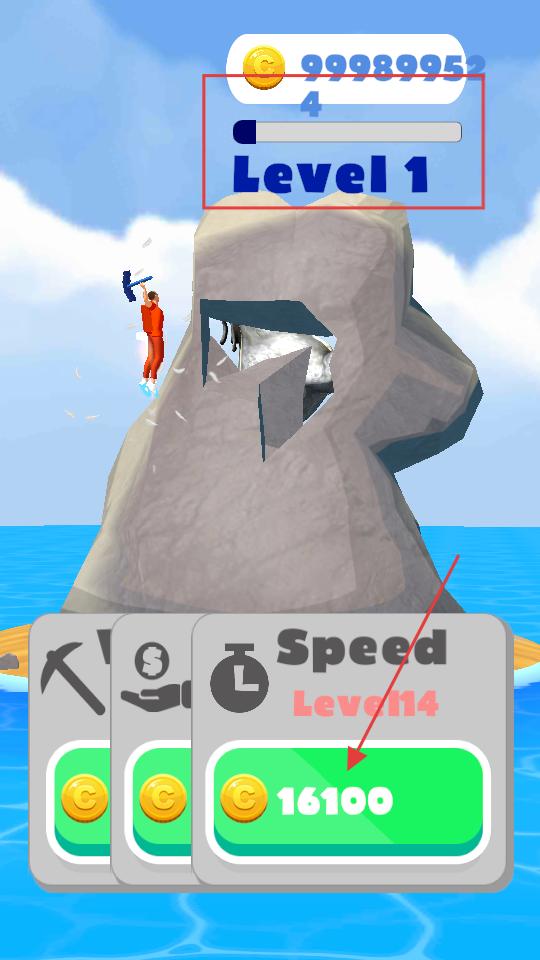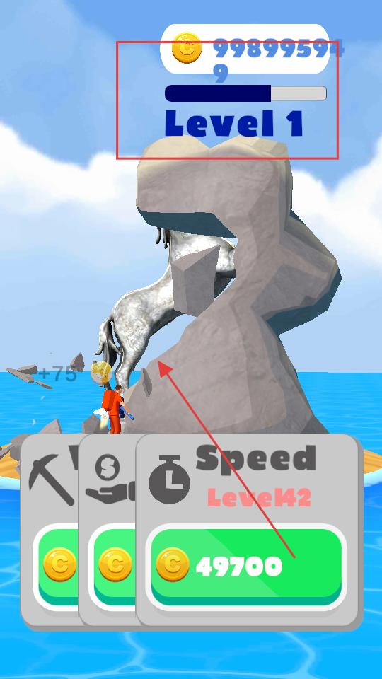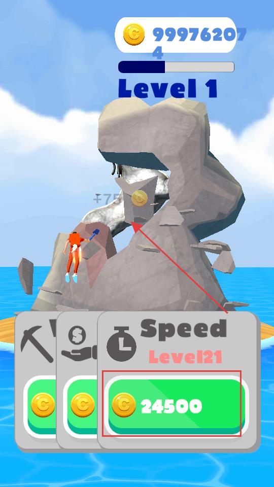 2、繼續花費金幣升級挖掘速度,隨著速度等級提升,角色挖掘巖石的效率變高,巖石上的缺口逐漸變大,能看到內部的部分輪廓。
