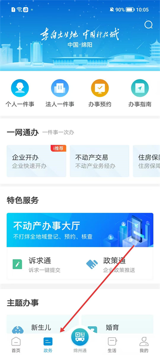 3、點擊政務板塊進入政務服務頁面,可查看個人一件事、法人一件事等服務分類,選擇不動產交易、住房保障等服務可辦理相關政務事項。