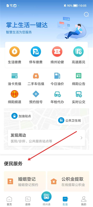 4、進入生活板塊可查看生活繳費、停車繳費等便民服務,選擇婚姻登記、公積金提取等服務可在線辦理相關業務,方便市民生活。