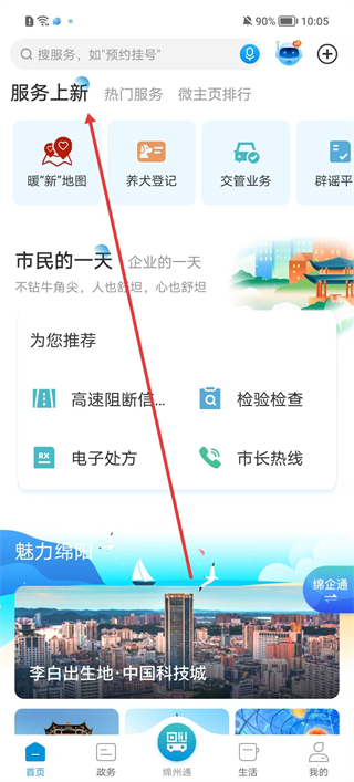 2、在服務上新頁面可查看暖新地圖、養犬登記等服務,了解市民的一天、企業的一天等政務場景,選擇感興趣的服務點擊進入辦理。