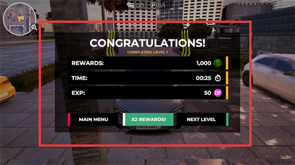 4、成功停車后會顯示通關界面,能看到獲得的獎勵、用時和經驗,此時可選擇返回主菜單、雙倍獎勵或進入下一關。