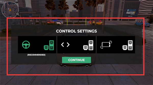 1、玩家進入游戲后,先在控制設置界面選擇推薦的方向盤控制方式,選好后點擊CONTINUE,即可開啟停車挑戰。