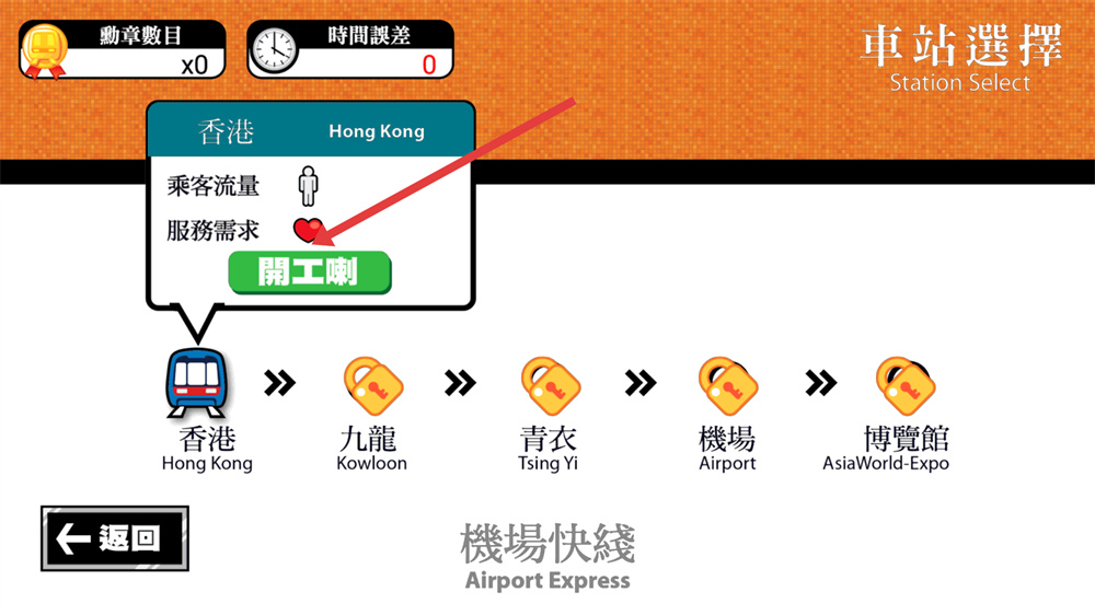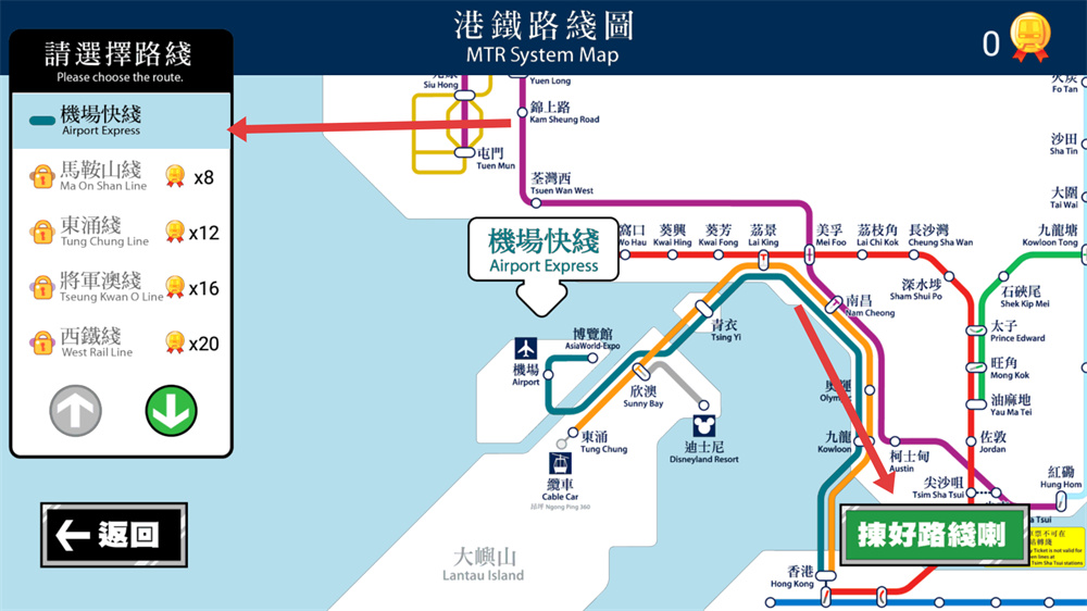 1、點擊開始游戲按鈕,進入路線選擇界面,這里展示了多條港鐵路線,玩家可根據喜好挑選一條想要體驗的路線。