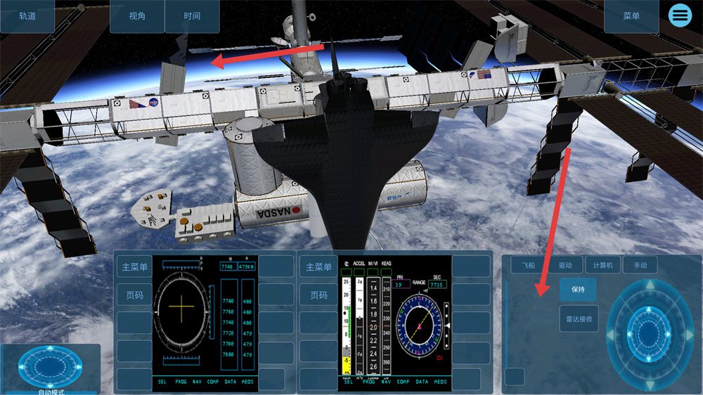 3、進入太空場景后,利用界面上的控制按鈕,調整航天器的飛行狀態,比如改變飛行方向速度等,在太空中進行探索。