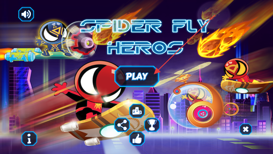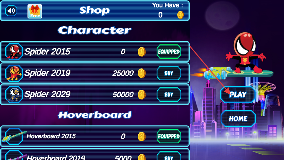 1、點擊界面中的PLAY按鈕,進入角色和滑板選擇界面,可查看不同的蜘蛛角色與懸浮滑板,選擇已解鎖的角色和滑板,準備開始游戲。