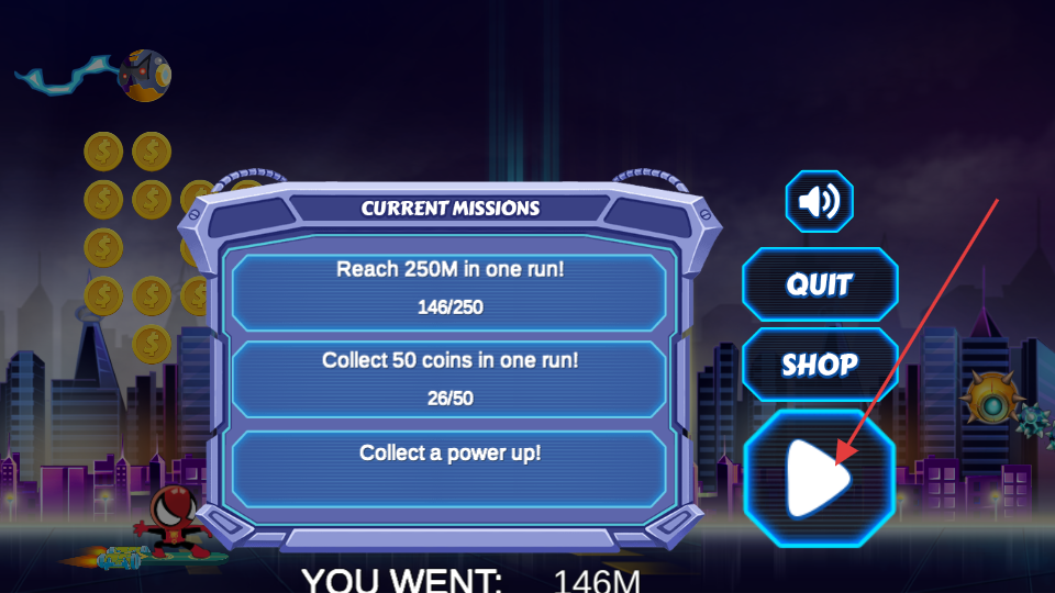 2、在選擇界面點擊右側的PLAY按鈕,進入城市背景的飛行場景,操控蜘蛛角色駕駛懸浮滑板,在城市上空飛行,收集途中的金幣。