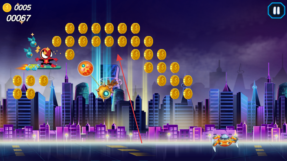 3、飛行過程中留意空中排列的金幣,調整滑板方向,盡可能多的收集金幣,同時注意躲避或應對出現的敵人和障礙物,保持飛行的持續。