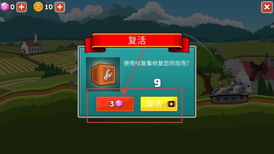 4、若坦克被敵方擊敗,彈出復活提示,可選擇用3個紫色寶石或觀看視頻復活坦克,復活后繼續參與越野射擊對戰。