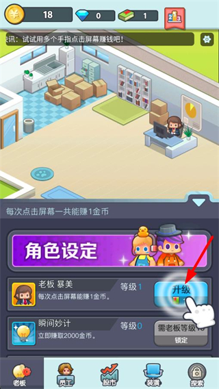 2、在角色設定界面,消耗資源點擊升級按鈕提升老板等級,增加每次點擊屏幕的金幣收益,提高賺錢效率。
