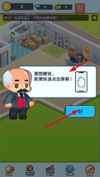 1、根據提示點擊屏幕可賺錢,點擊好關閉提示,開始通過點擊屏幕積累初始資金,推進創業流程。