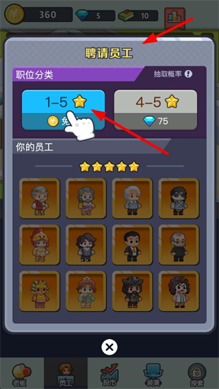 4、進入聘請員工界面,選擇對應分類抽取員工,擴充團隊成員,助力后續的創業經營,提升整體收益能力。