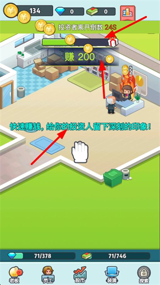 3、在投資人倒計時階段,快速點擊屏幕賺取金幣,達成目標金額給投資人留下印象,積累更多創業資源。