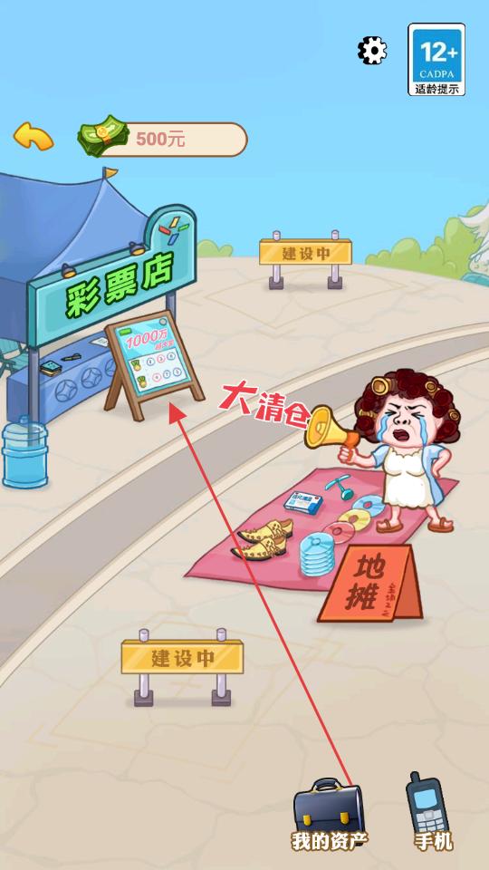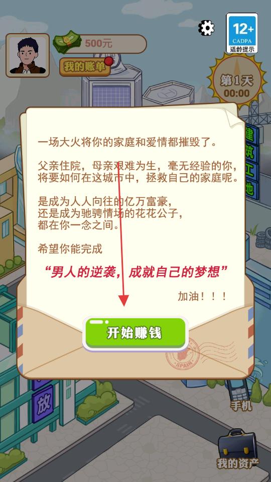 1、進入游戲后點擊開始賺錢按鈕,開啟在城市里的逆襲旅程,此時會進入有地攤、彩票店的初始場景,準備開展賺錢相關操作。