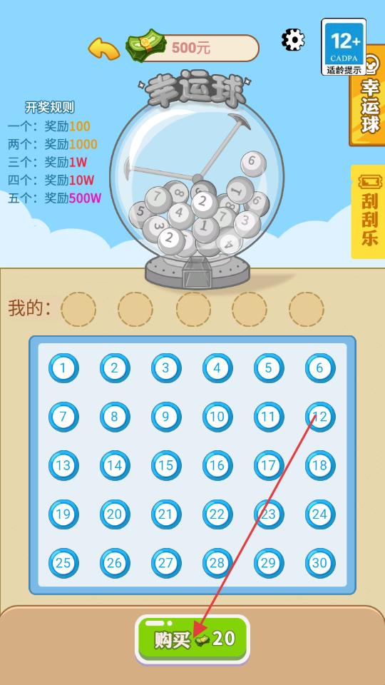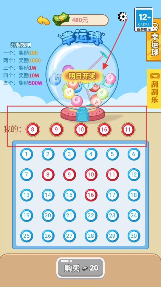 3、在幸運球選號區域,點擊數字選擇彩票號碼,選好后點擊購買按鈕,花費20元獲取一組號碼,此時界面會顯示已選的號碼。