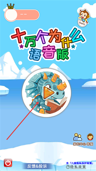 2、應用主界面,顯示十萬個為什么語音版,點擊卡通形象可播放內容,還有家長中心和客服功能。