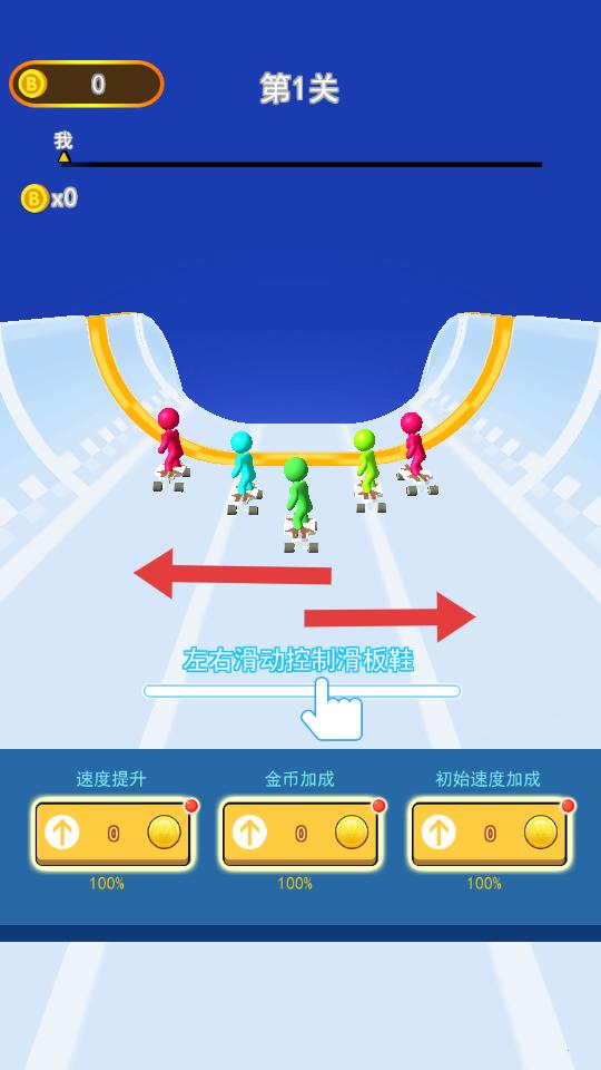 1、在第1關開始界面,通過左右滑動控制滑板鞋移動,可利用速度提升、金幣加成等功能,為滑行助力,準備開始比賽。