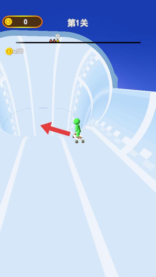 2、操控滑板角色在賽道上滑行,沿著箭頭指引方向前進,注意躲避其他選手,同時收集金幣,提升自身優勢。