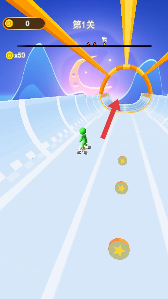 3、繼續在賽道上滑行,朝著帶有圓環的目標區域前進,途中收集星星等道具,積累分數,為闖關成功創造條件。