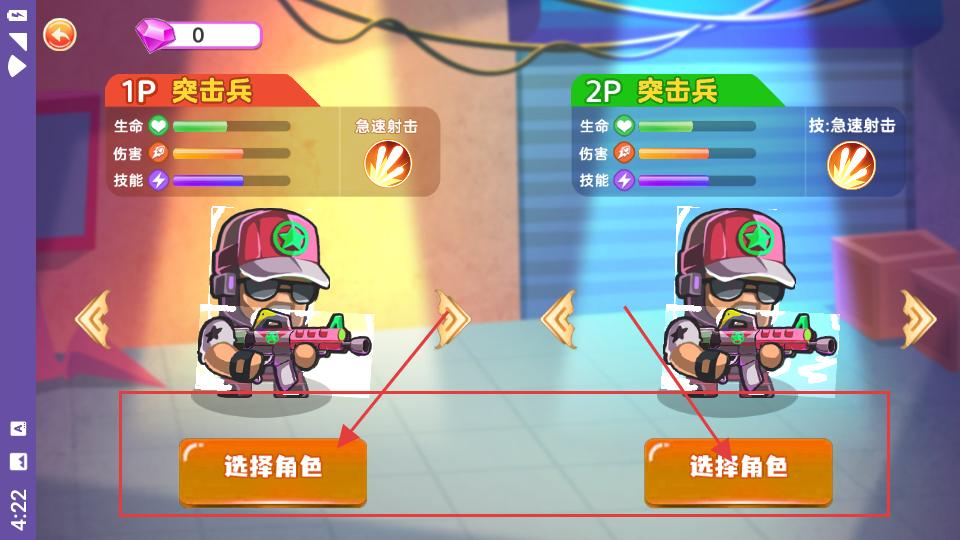 2、在角色選擇界面點擊1P和2P對應的選擇角色按鈕,選定合適的突擊兵等角色,確認后進入關卡戰斗場景,查看關卡目標與雙方初始金幣數。