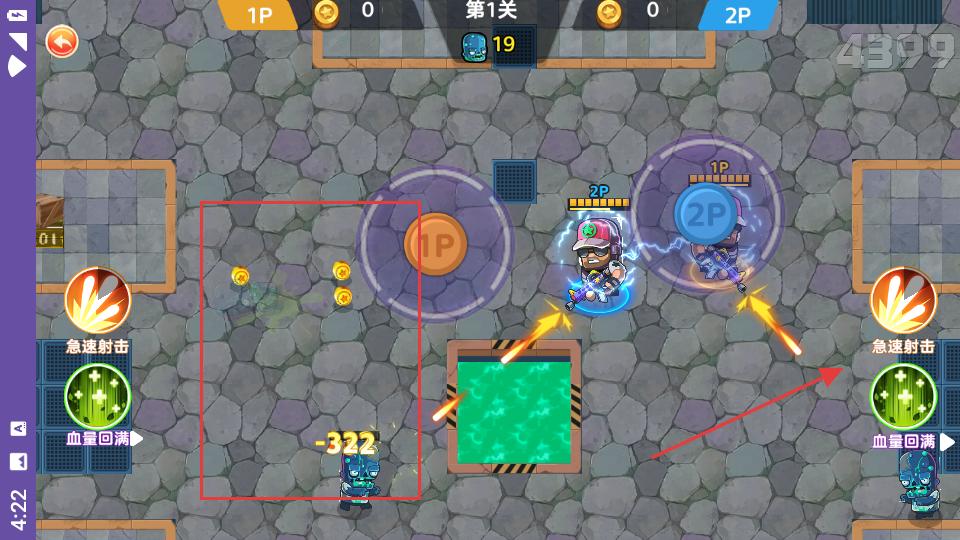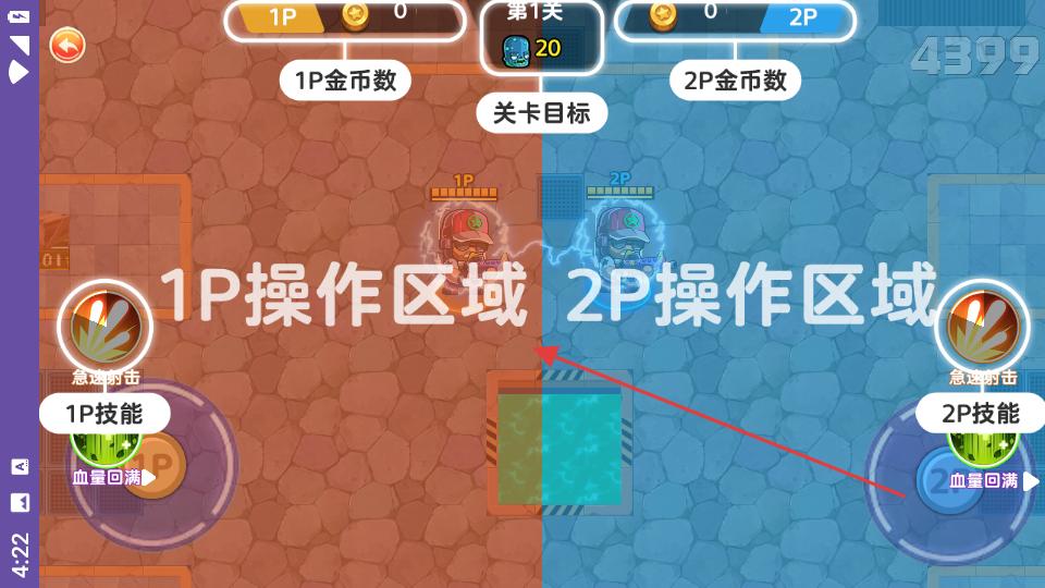 3、進入第1關戰斗1P在左側操作區域、2P在右側操作區域,使用急速射擊技能攻擊敵人,也可借助血量回滿技能恢復生命值,協同開展戰斗。