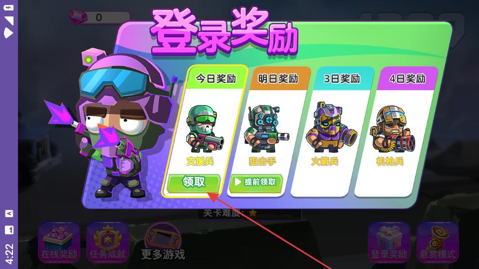 1、進入游戲領取登錄獎勵,可選今日獎勵的支援兵等角色,獲取初始角色后,進入角色選擇界面,準備為1P和2P挑選戰斗角色。