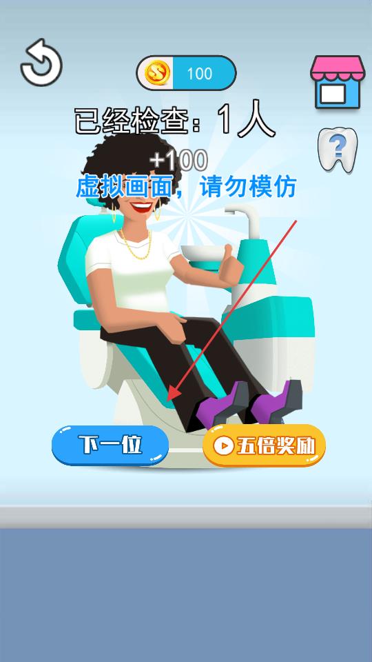 3、完成一位患者的牙齒處理后,界面顯示獲得100金幣,此時可點擊下一位按鈕接待新患者,或選擇五倍獎勵看視頻獲取更多金幣。