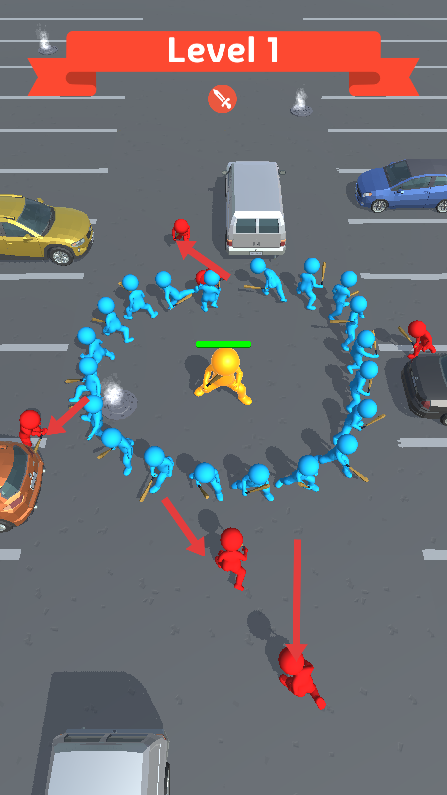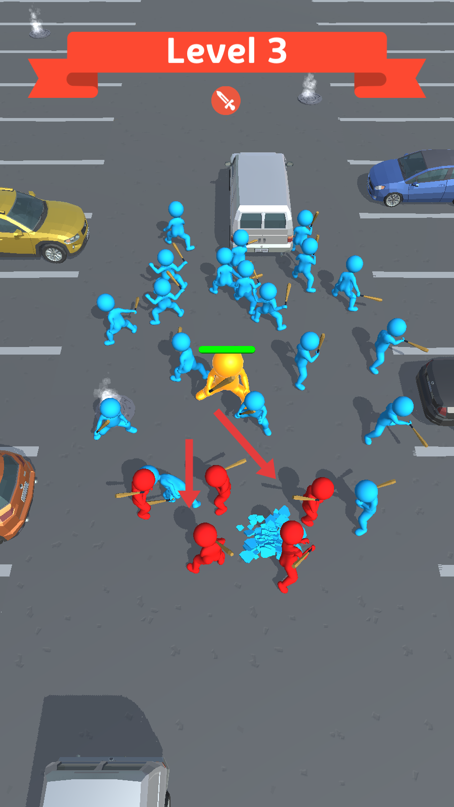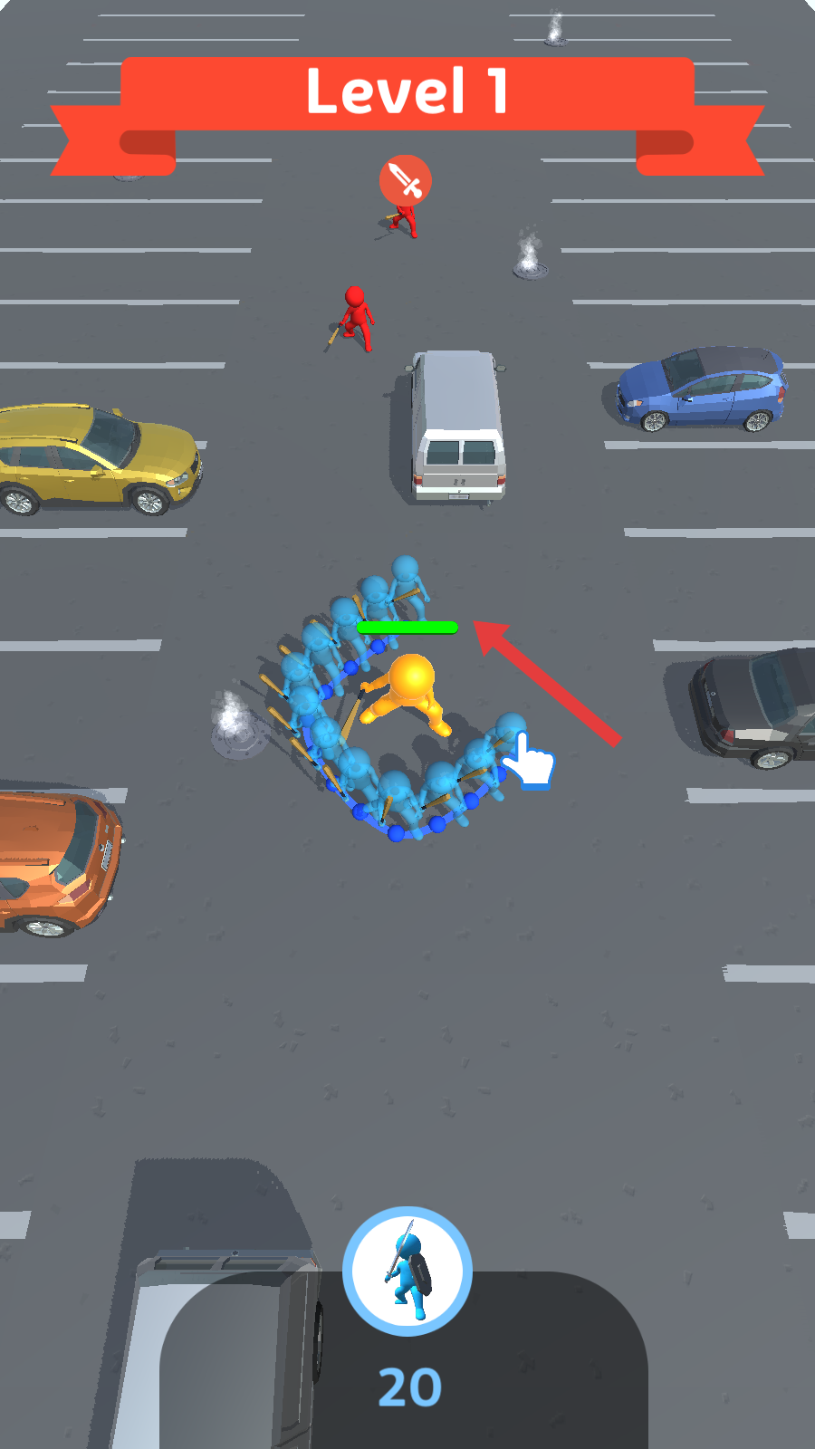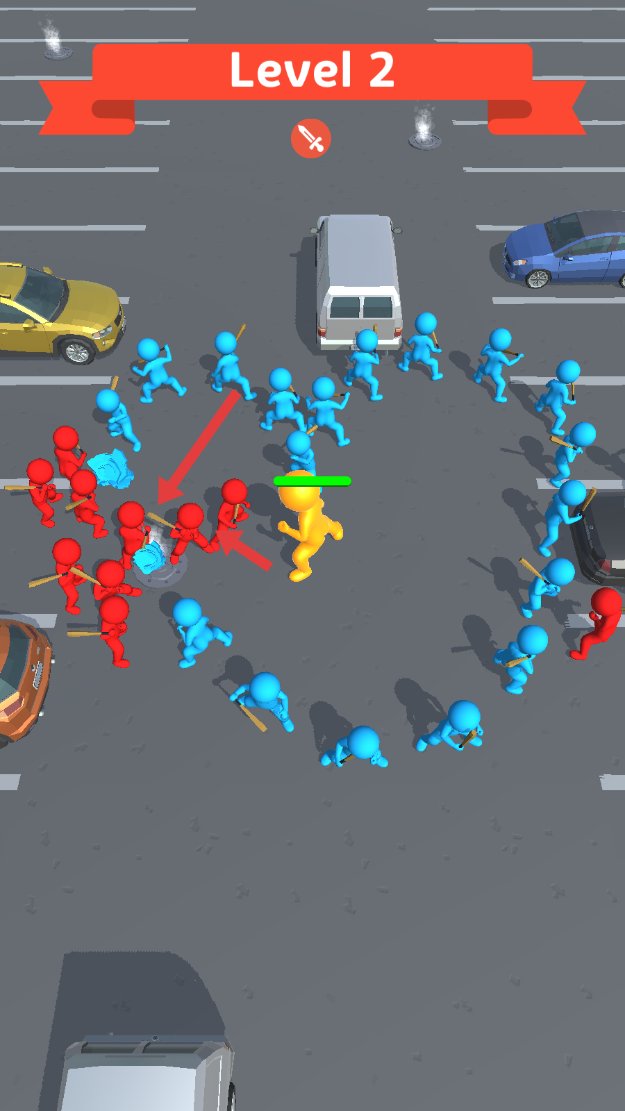 2、指揮藍色小人移動,調整陣型,主動出擊紅色敵人,在停車場場景中與敵人展開戰斗,爭奪優勢。