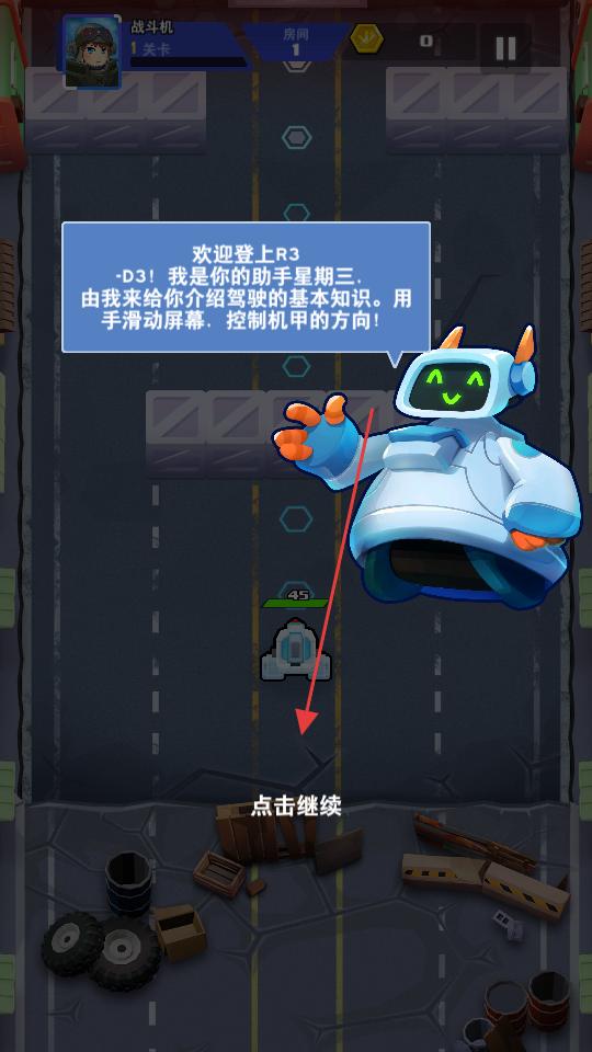 1、點擊點擊繼續進入助手星期三的介紹環節,了解用手滑動屏幕控制機甲方向的駕駛基本知識,為后續操作做好準備。