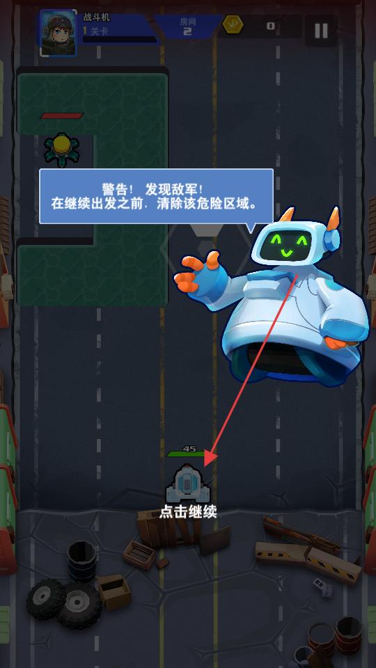 3、看到警告發現敵軍的提示后,點擊點擊繼續,準備進入清除危險區域的戰斗環節,為繼續出發做準備。