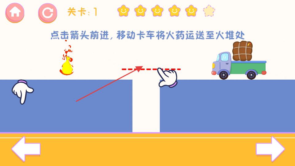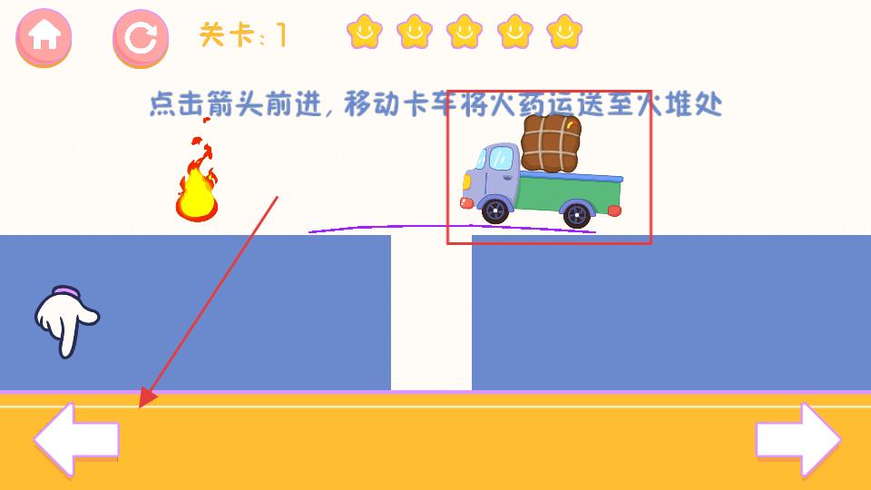 2、進入關卡1后根據提示通過畫線的方式,畫出一條路,讓卡車朝著火堆的方向移動。