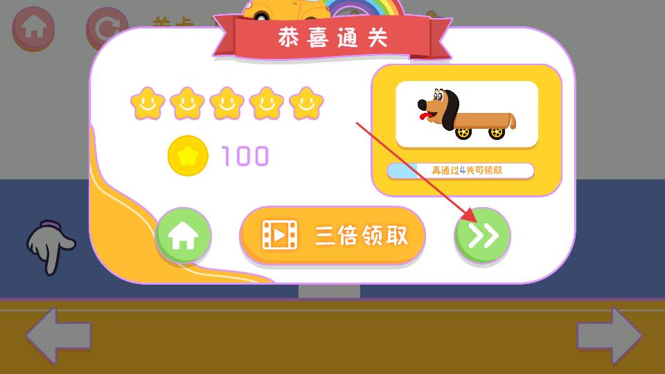 4、當卡車成功將火藥運送至火堆處后,游戲會顯示恭喜通關界面,此時可選擇領取金幣,或者點擊箭頭按鈕進入下一個關卡繼續游戲。