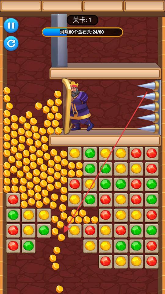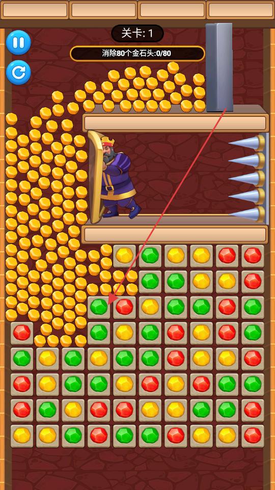 2、進入關卡1后觀察下方的彩色寶石,通過點擊或滑動的方式,讓相同顏色的寶石消除,消除后會有金石頭掉落,逐步積累消除的金石頭數量。